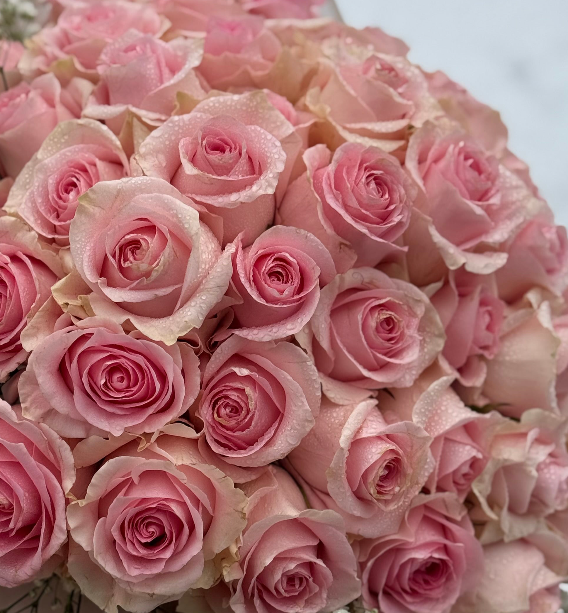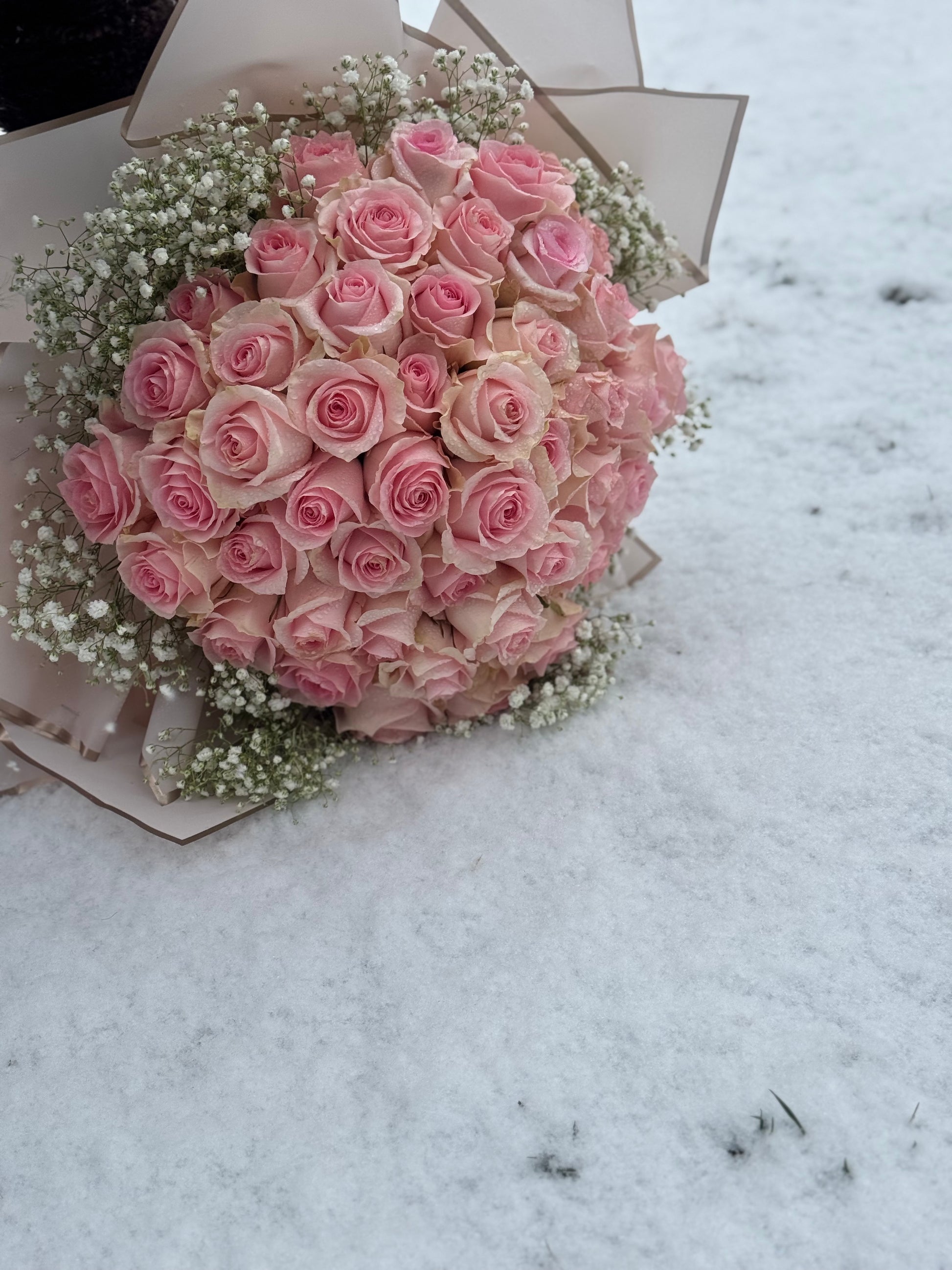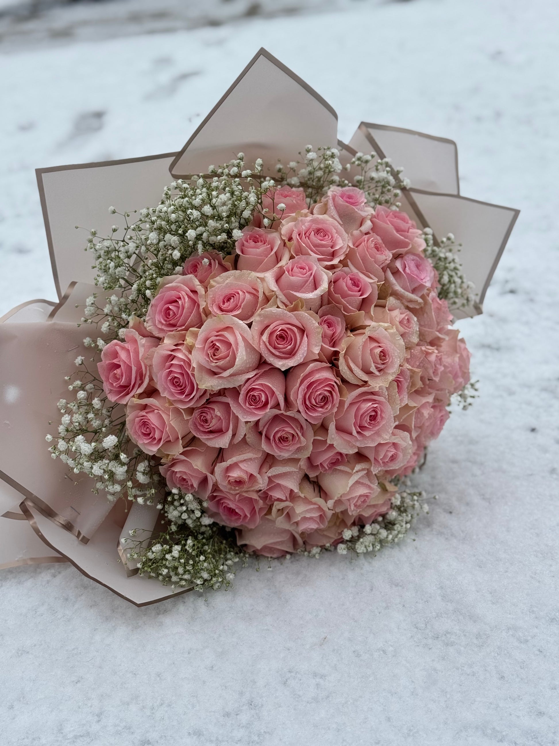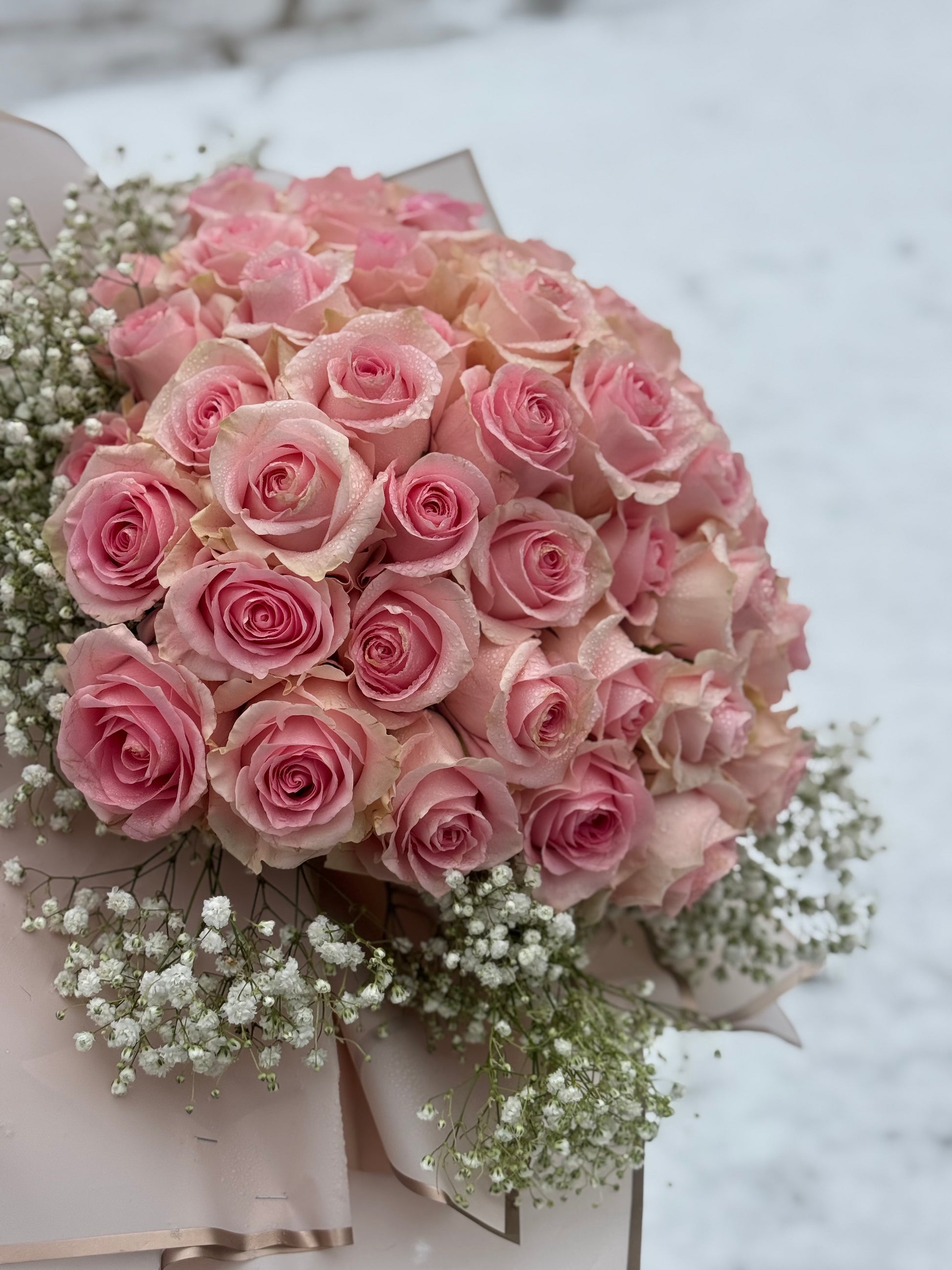 50 Pink Roses with baby breath. Perfect for birthday, love, valentines day and photoshoots.